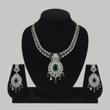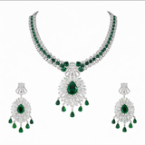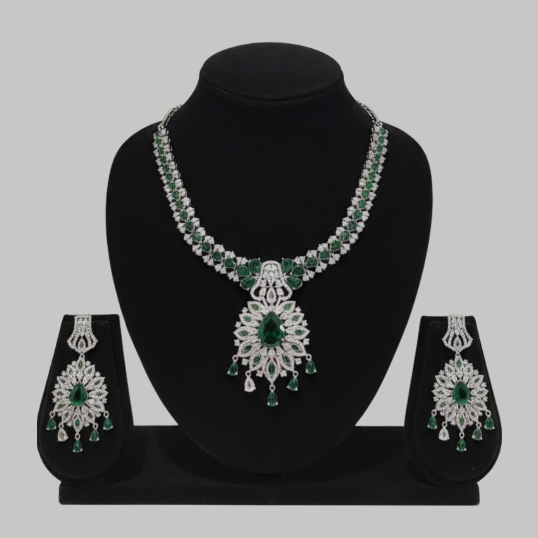 The Emerald Majesty Necklace Set features rich emerald-toned stones beautifully framed with dazzling American diamonds. The intricate floral-inspired pendant with delicate drop accents creates a grand yet graceful look.