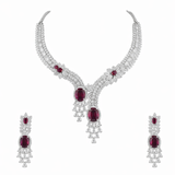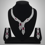 The Ruby Royale Statement Necklace Set is designed to captivate. Featuring deep ruby-toned center stones surrounded by intricate American diamond detailing, this masterpiece radiates grandeur and sophistication.